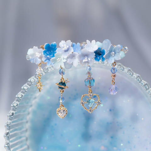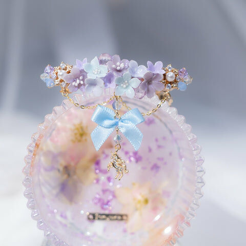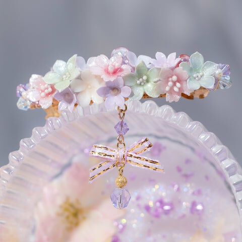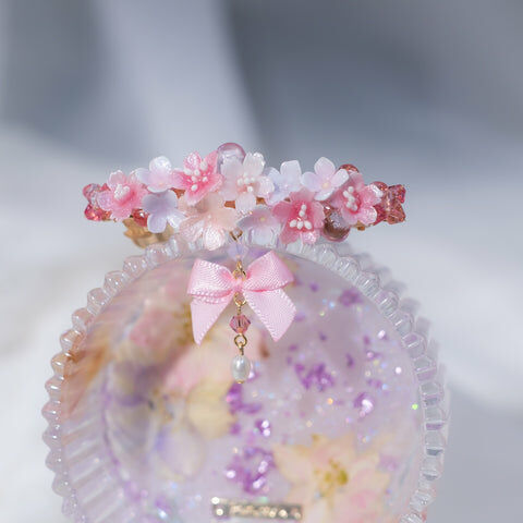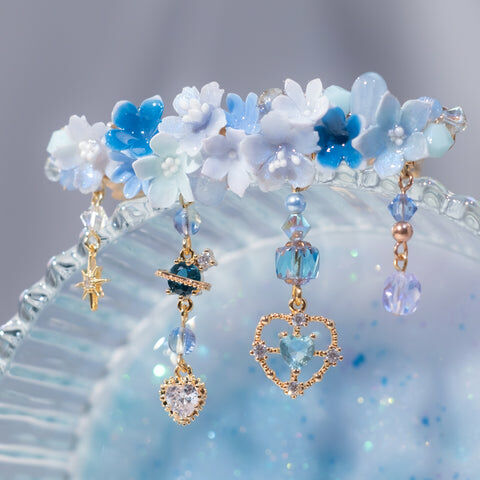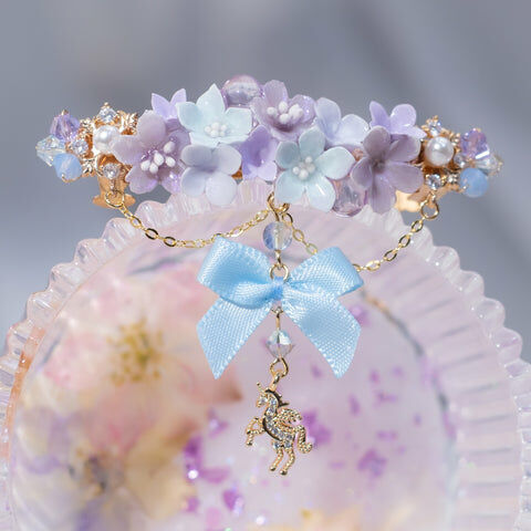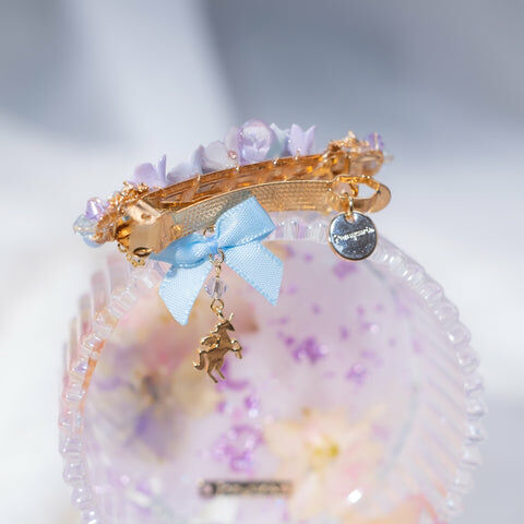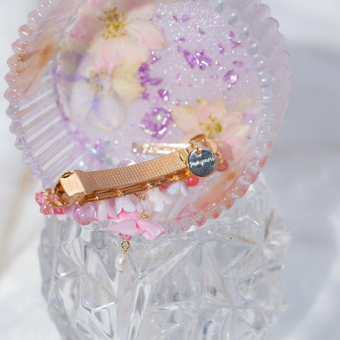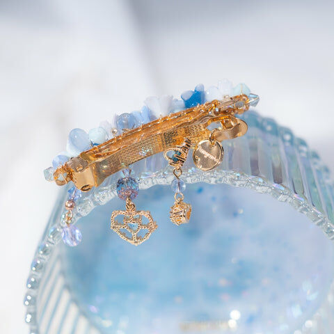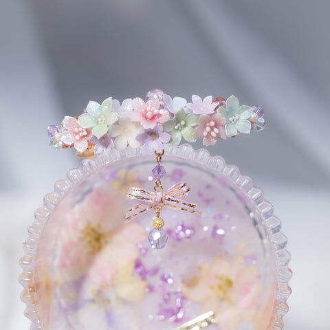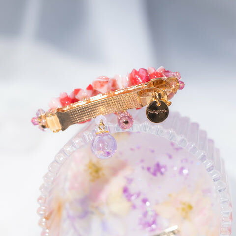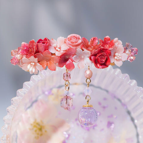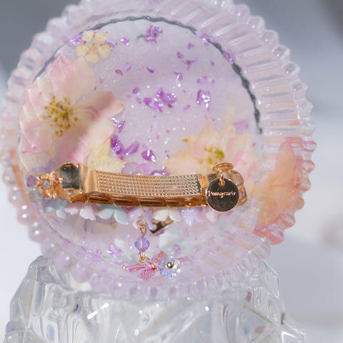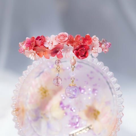 鍍金線 | 施華洛世奇水晶 | 手製樹脂黏土花 | UV膠強化保護層 | 金屬髮夾