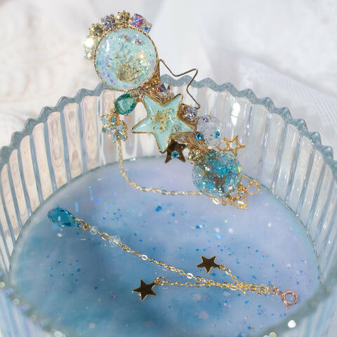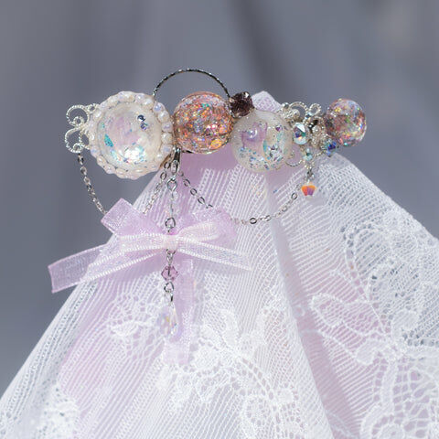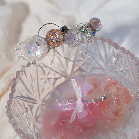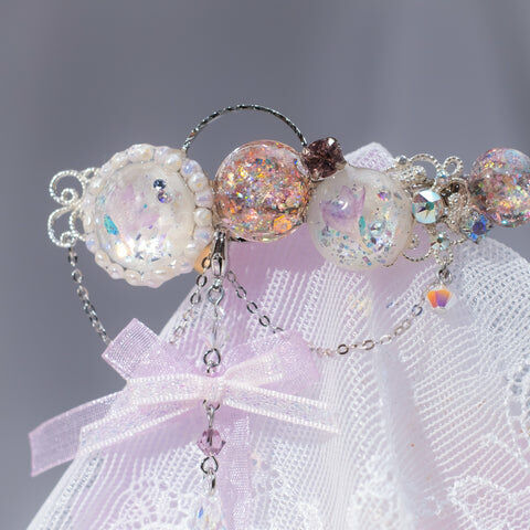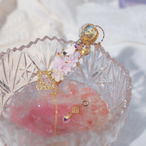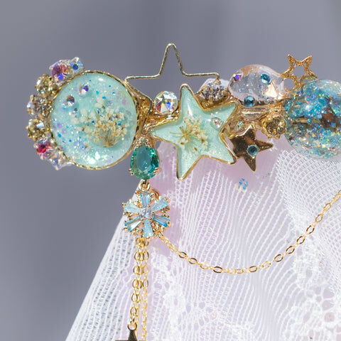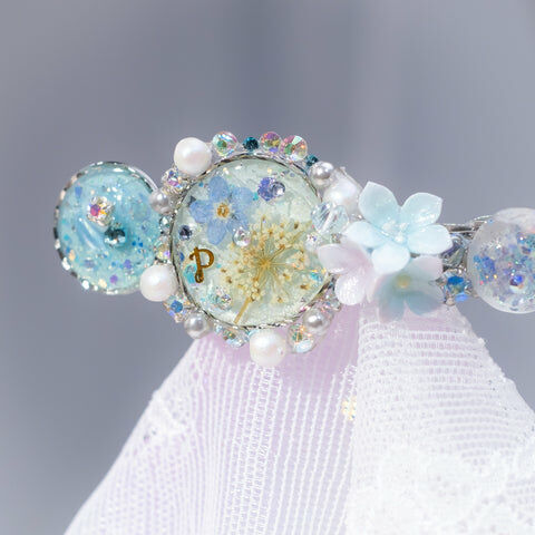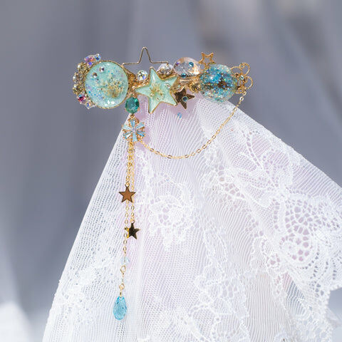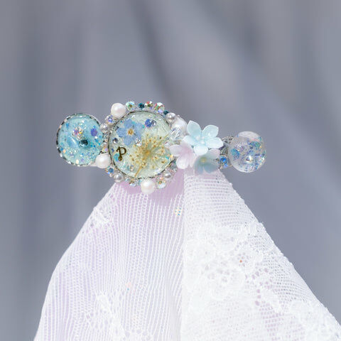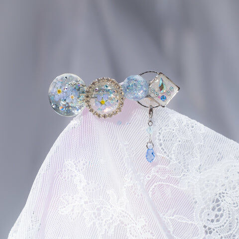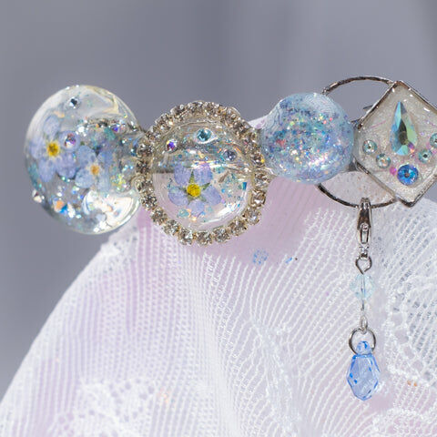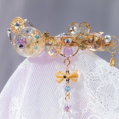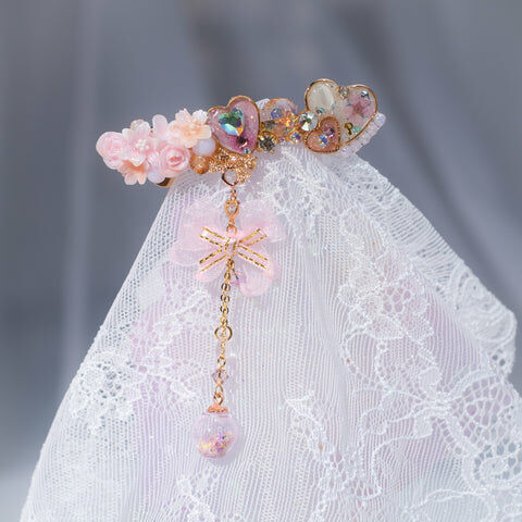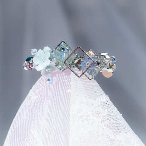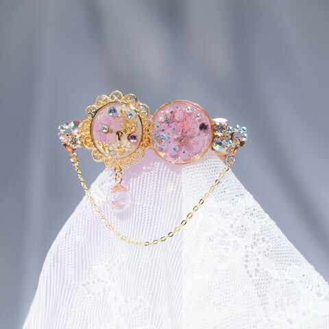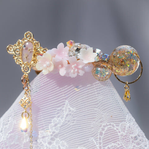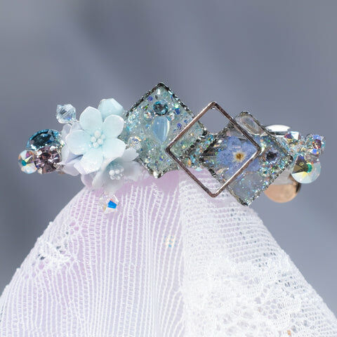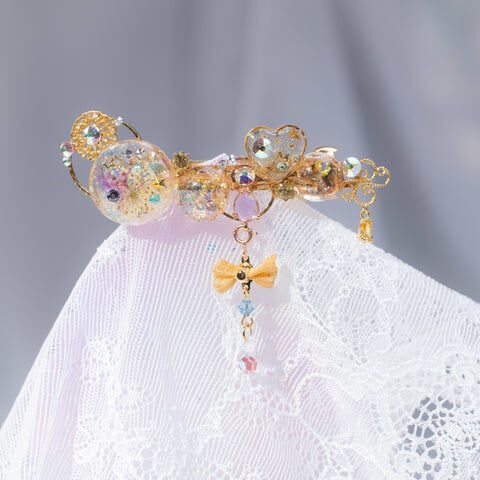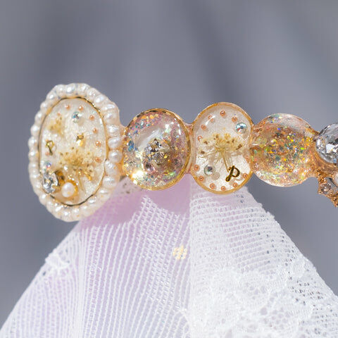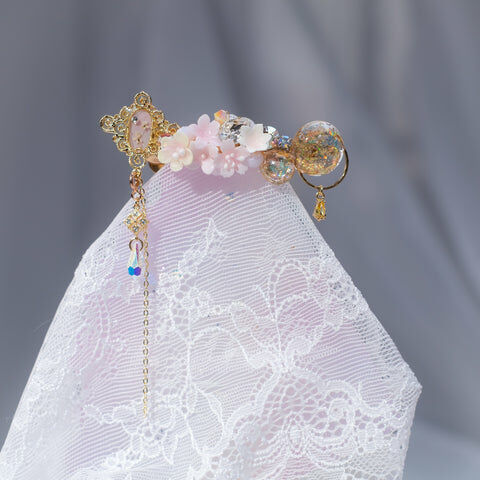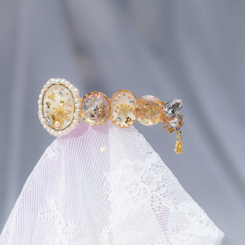 鍍金線 | 施華洛世奇水晶 | 手製樹脂黏土花 | UV膠強化保護層 | 金屬髮夾