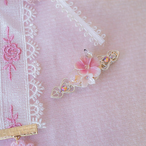 鍍金線 | 施華洛世奇水晶 | 手製樹脂黏土花 | UV膠強化保護層 | 金屬髮夾